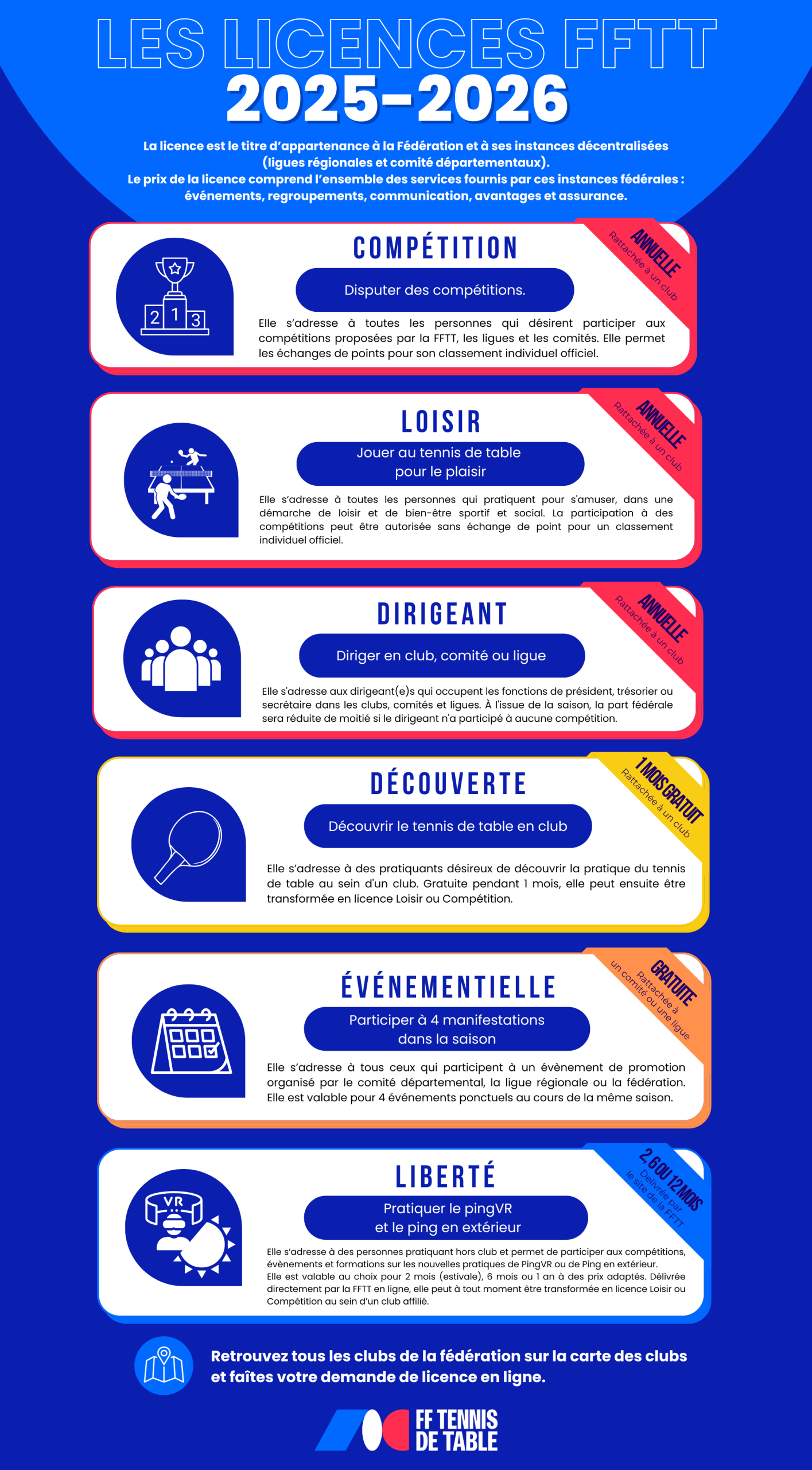 6 types de licences : https://www.fftt.com/site/jouer/licences/licences-mode-d-emploi