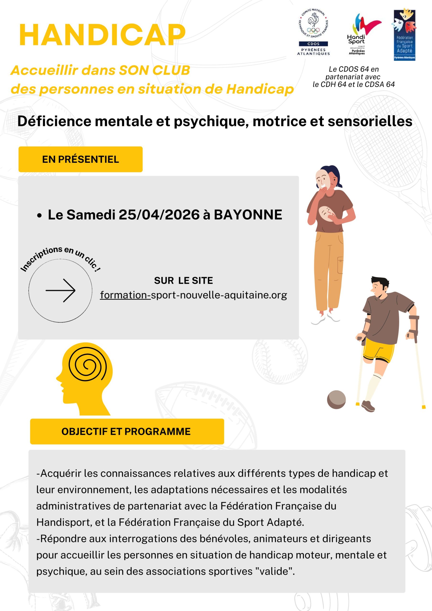Comme chaque année le CDOS 64 tente de proposer à vos clubs des formations afin d’élargir le spectre de leurs capacités d’accueil et ainsi l’accessibilité du sport sur le territoire.