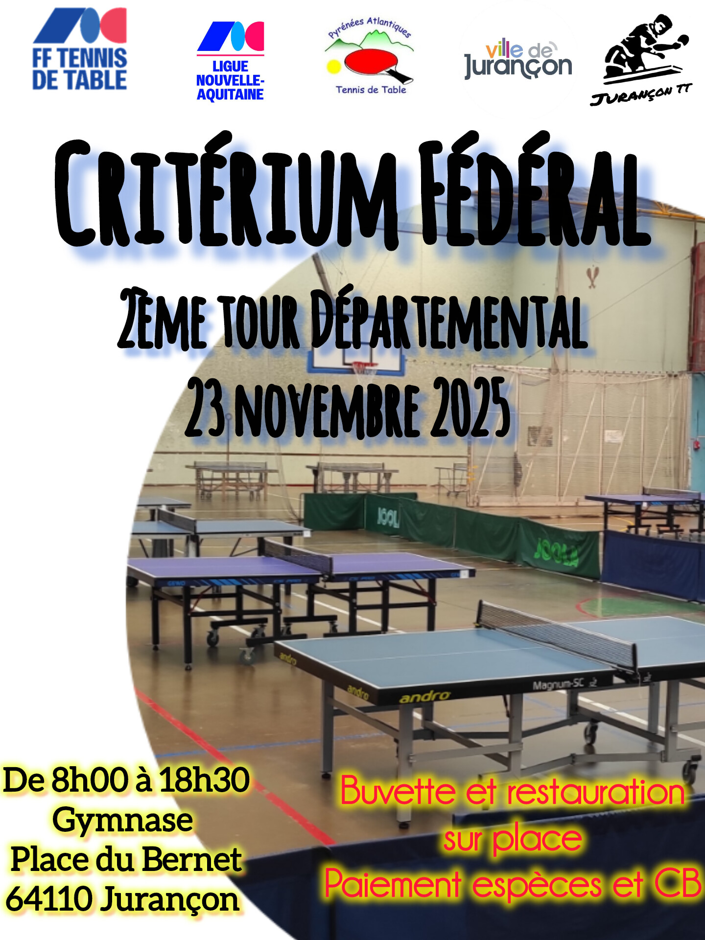 En cas de modification (Repêchage R1 Sud, forfait, …), il n’y aura pas de nouvelle diffusion, mais uniquement une mise à jour sur le site du comité – https://cd64tt.fr/criterium-federal/